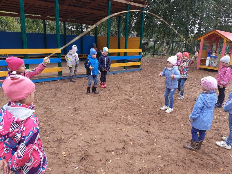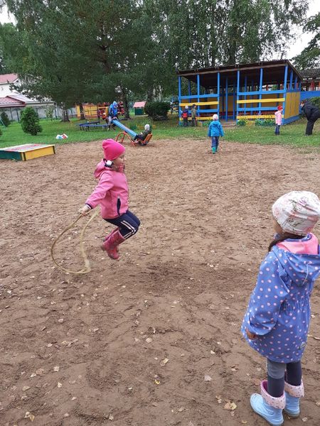 Глядя на Леру Г., Алиса тоже захотела научиться прыгать через скакалку Теперь они прыгают вдвоём.