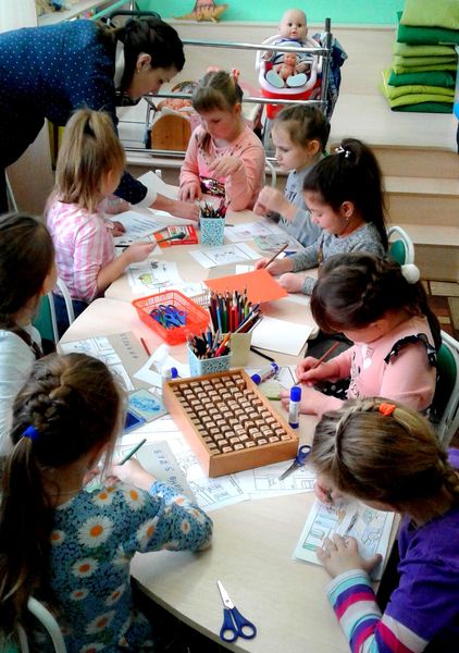 Довольно большая компания занималась изготовлением памяток и плакатов с надписями, которые дети писали и печатали буквенными штампами.
