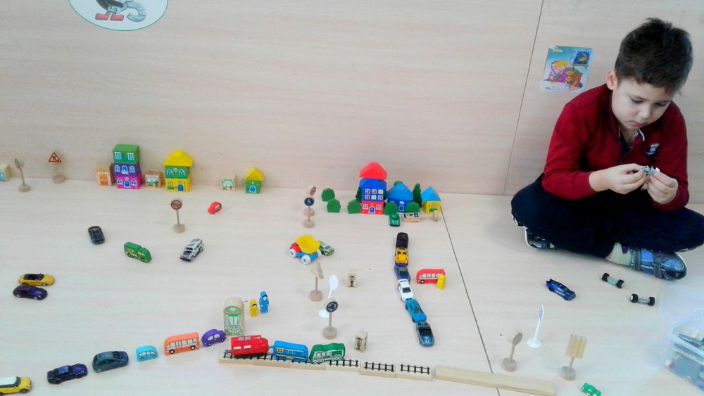 На подиуме раскинулся целый городской район - с парками, стадионами, зданиями и, конечно, дорогами. А примерно из 15-20 игрушечных авто дети выстроили дорожную "пробку" - конечно, куда же без жизненных реалий!