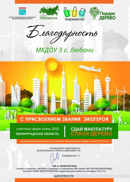 С 22 сентября по 9 октября 2020 года дети и родители нашего детского сада приняли участие в Эко-марафоне ПЕРЕРАБОТКА. «Сдай макулатуру – Спаси дерево!».